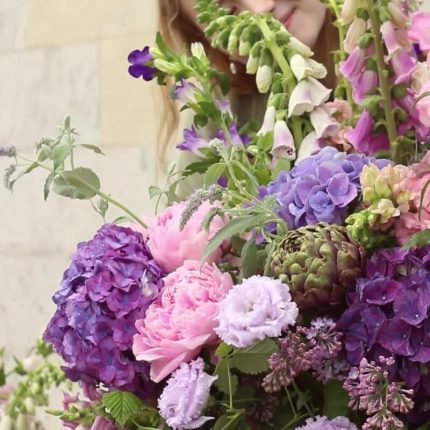 Садовая композиция с гортензиями, пионами, пионвоидными розами и колокольчиками