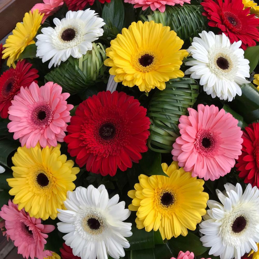 Аспидистра – 5 шт.Корзина – 1 шт.Зелень – 15 шт.Гербера – 61 шт.Фисташка – 15 шт.Берграсс пучок – 1 шт.Оазис флористический – 4 шт.