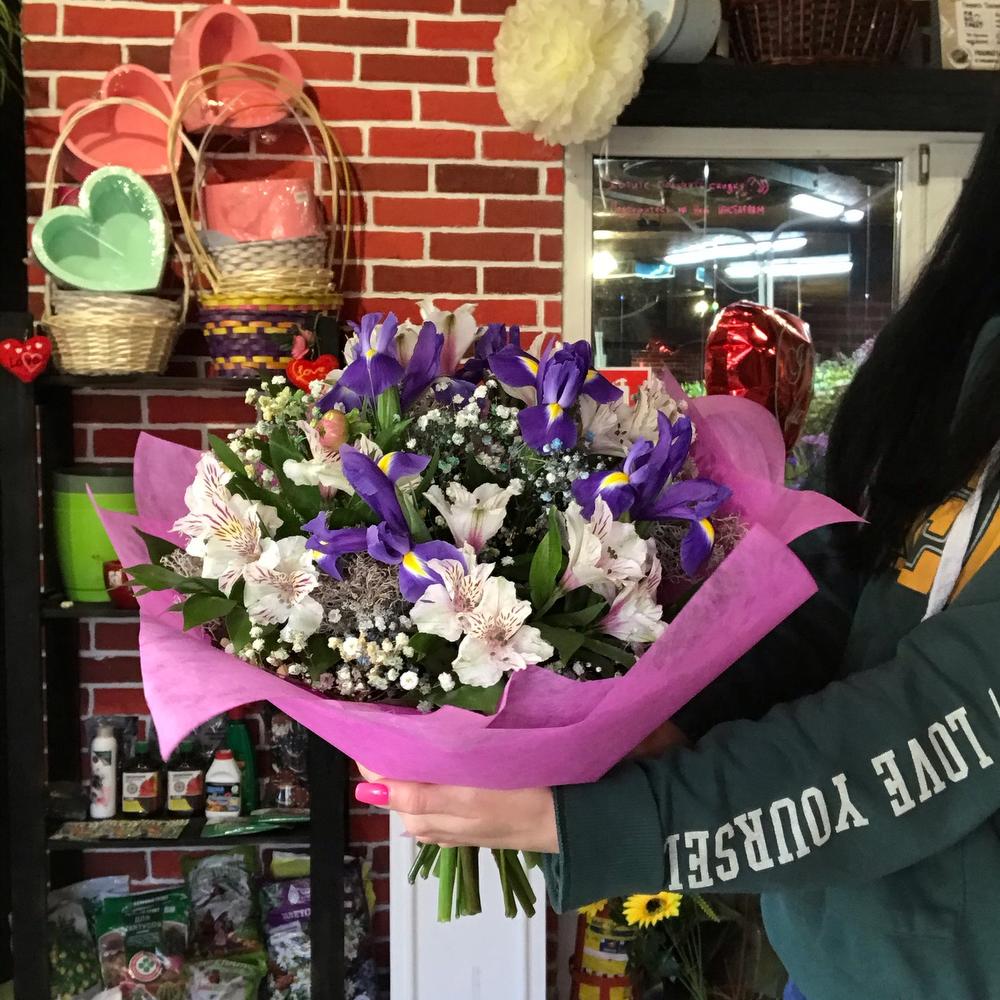 Альстромерия – 5 шт.Гипсофила – 2 шт.Ирис – 7 шт.Упаковка дизайнерская – 2 шт.зелень декоративная – 5 шт.