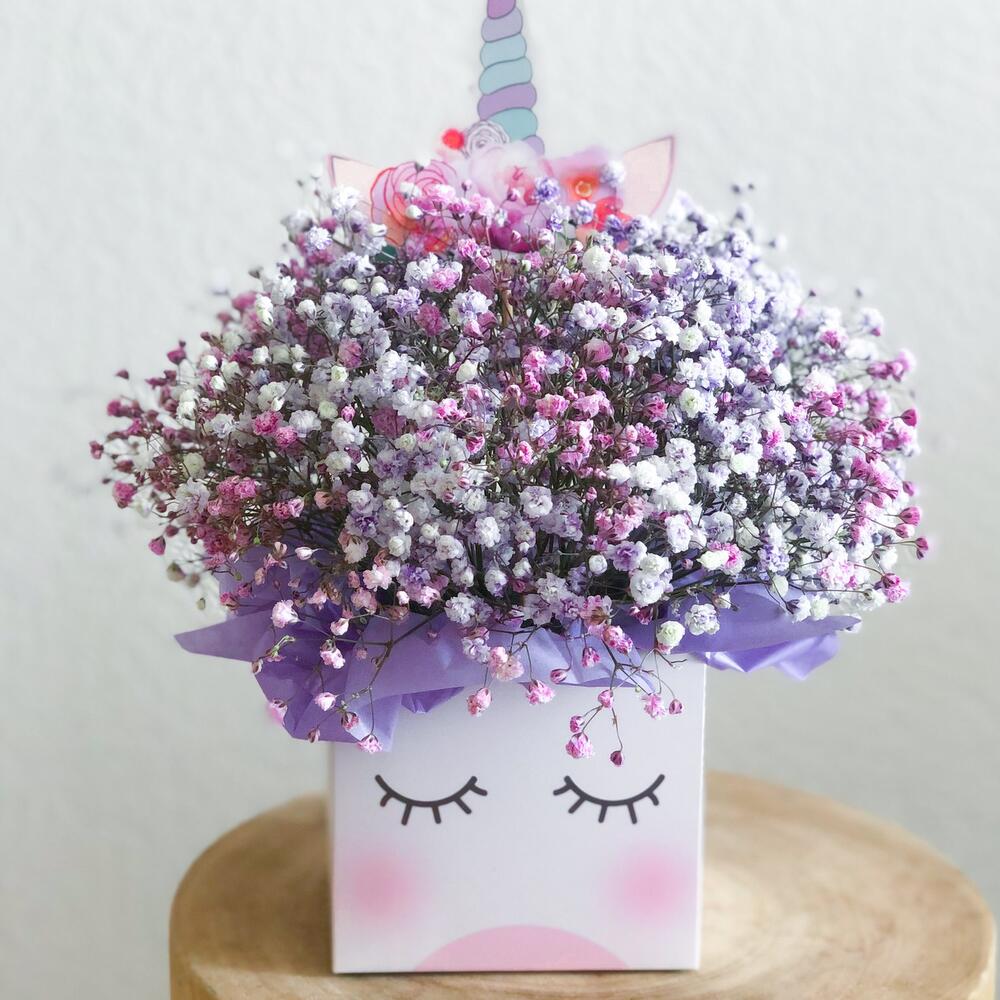 гипсофила цветная – 5 шт.коробка единорог – 1 шт.Тишью – 4 шт.Лента атласная – 1 шт.Оазис флористический – 1 шт.Упаковка транспортировочная пленка – 1 шт.