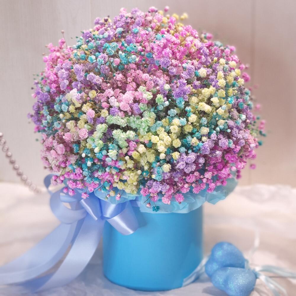 Лента атласная – 1 шт.Коробка шляпная – 1 шт.Открыточка с вашими пожеланиями – 1 шт.Оазис флористический – 1 шт.гипсофила радужная – 7 шт.