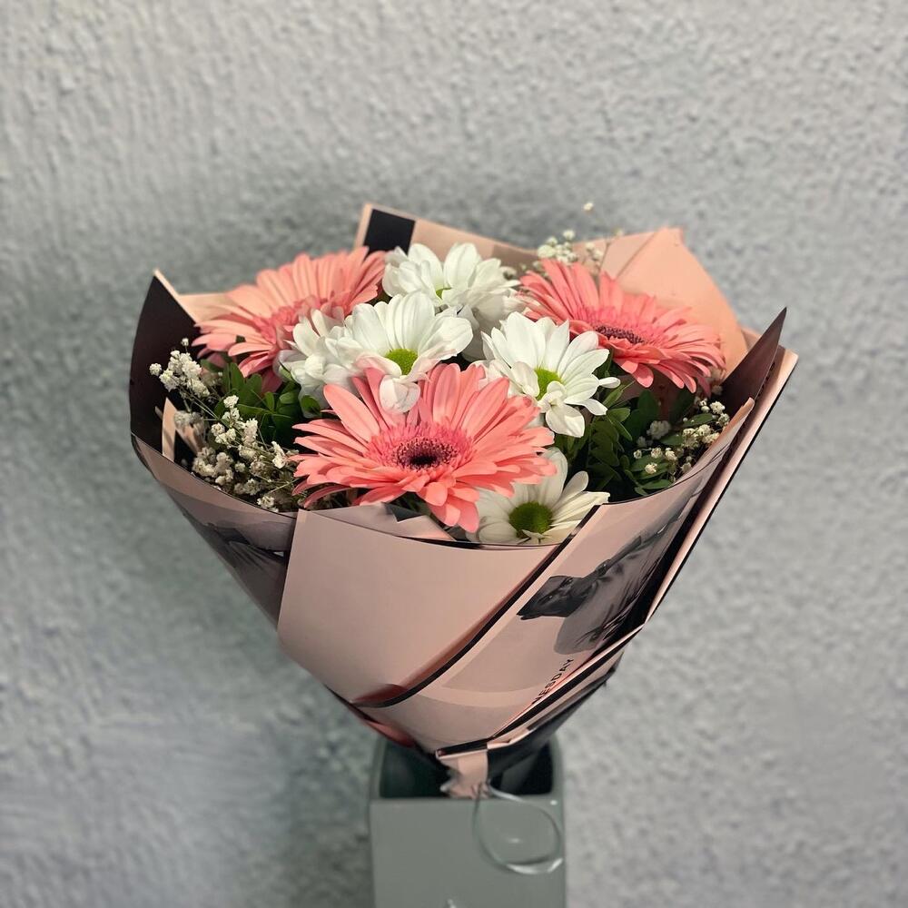 герберы – 3 шт.Хризантема кустовая – 1 шт.Гипсофила – 2 шт.фисташка зелень – 3 шт.Упаковка дизайнерская – 1 шт.