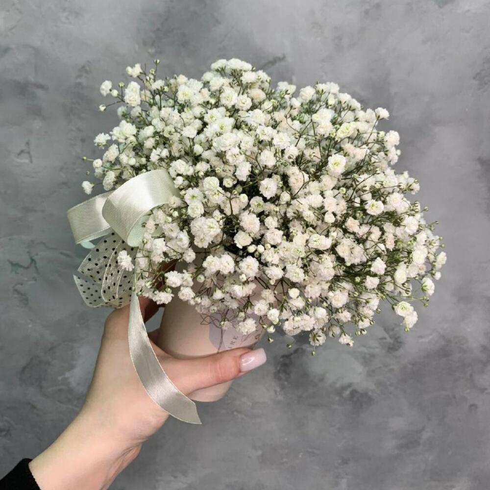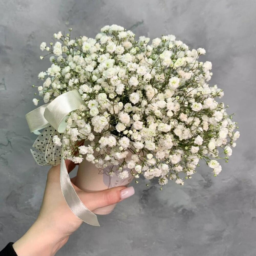 Гипсофила – 4 шт.Оазис флористический – 1 шт.лента бант – 2 шт.крафтовый дизайнерский Стакан – 1 шт.