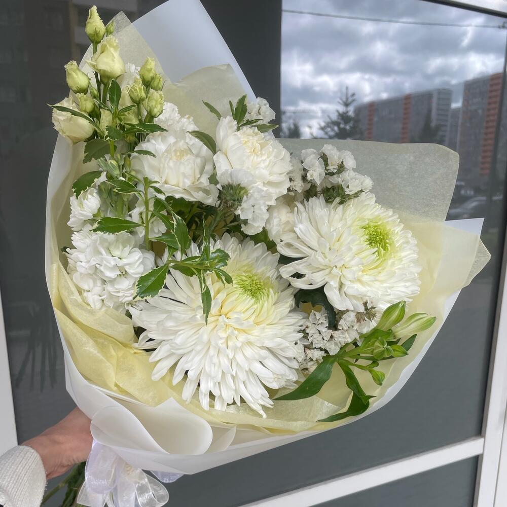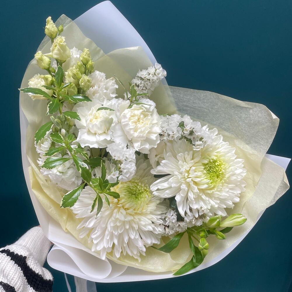 Хризантема – 2 шт.Статица – 1 шт.Альстромерия – 1 шт.Питтоспорум – 1 шт.Лизиантус – 1 шт.Диантус – 3 шт.Упаковка дизайнерская – 1 шт.