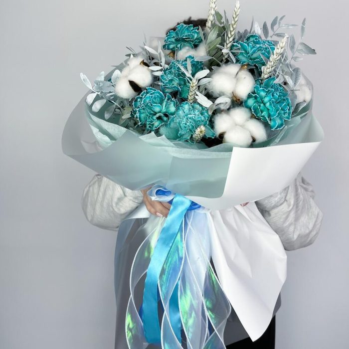 Гвоздика – 7 шт.Лента атласная – 4 шт.Фисташка – 3 шт.Пленка матовая – 4 шт.Хлопок натуральный – 5 шт.Тишью белое – 4 шт.колосок полевой – 5 шт.