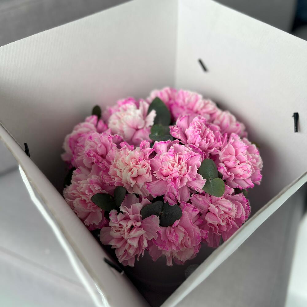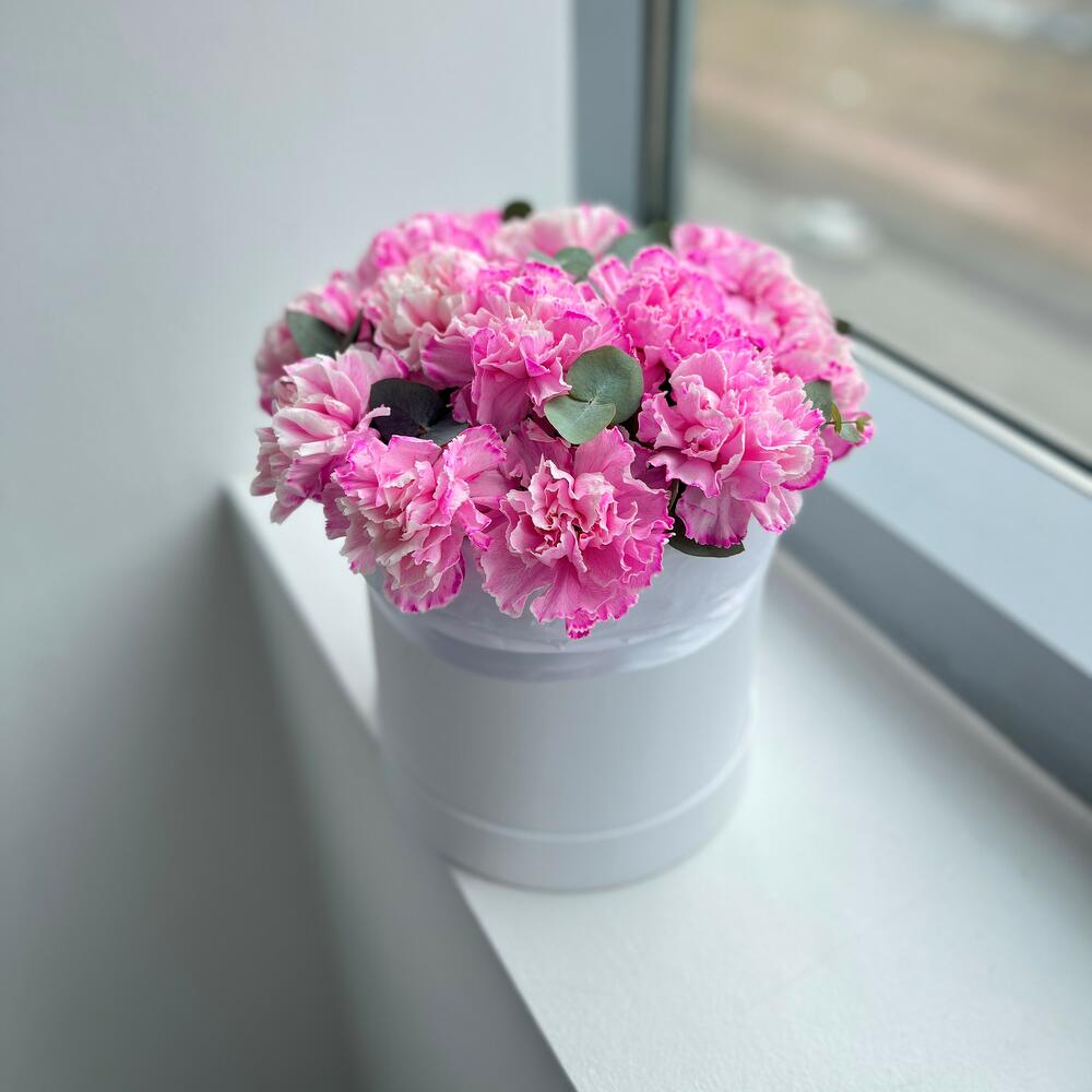 Шляпная коробка с ярко-розовой гвоздикой и эвкалиптом, небольшого размера, 20 см в диаметре и 25 см высотой