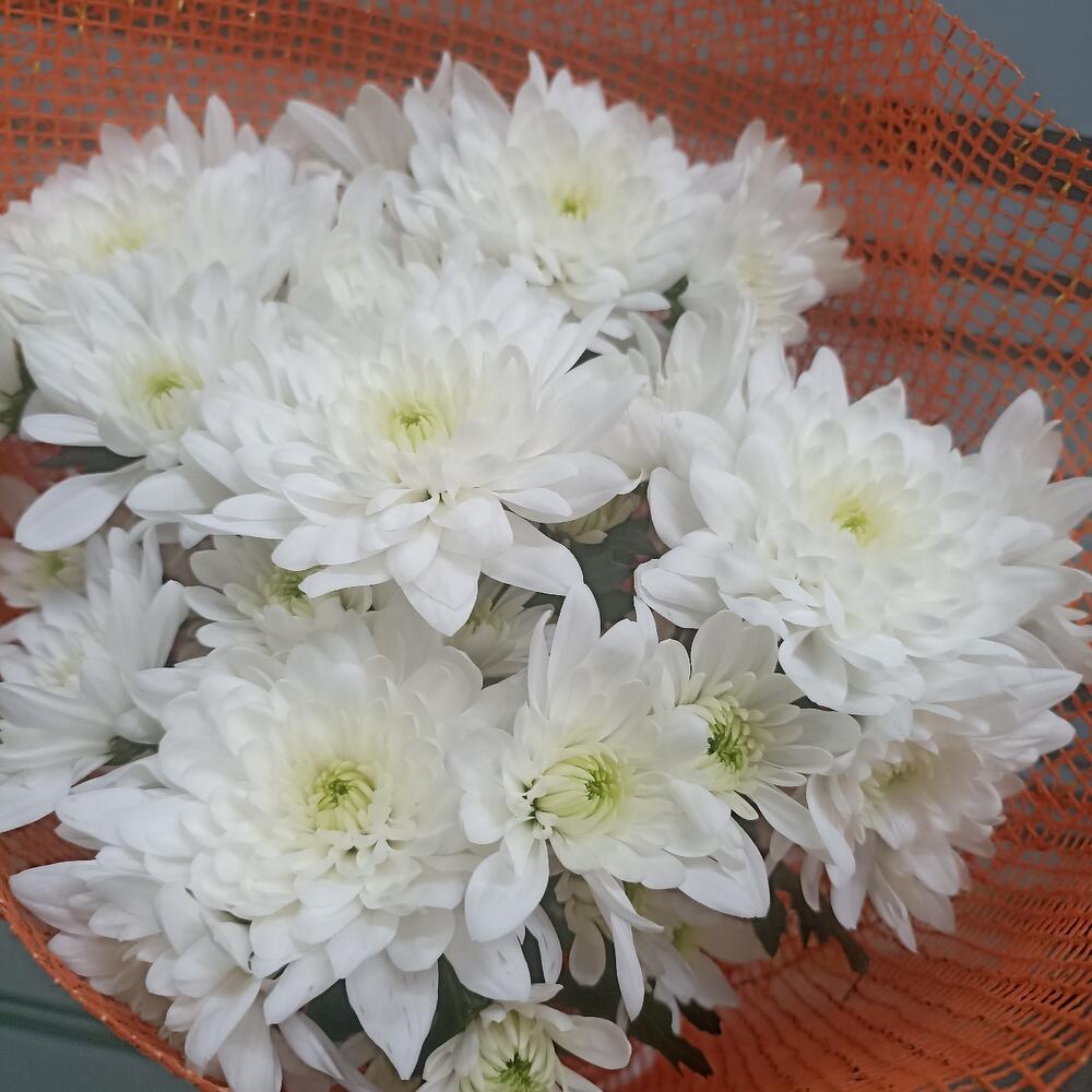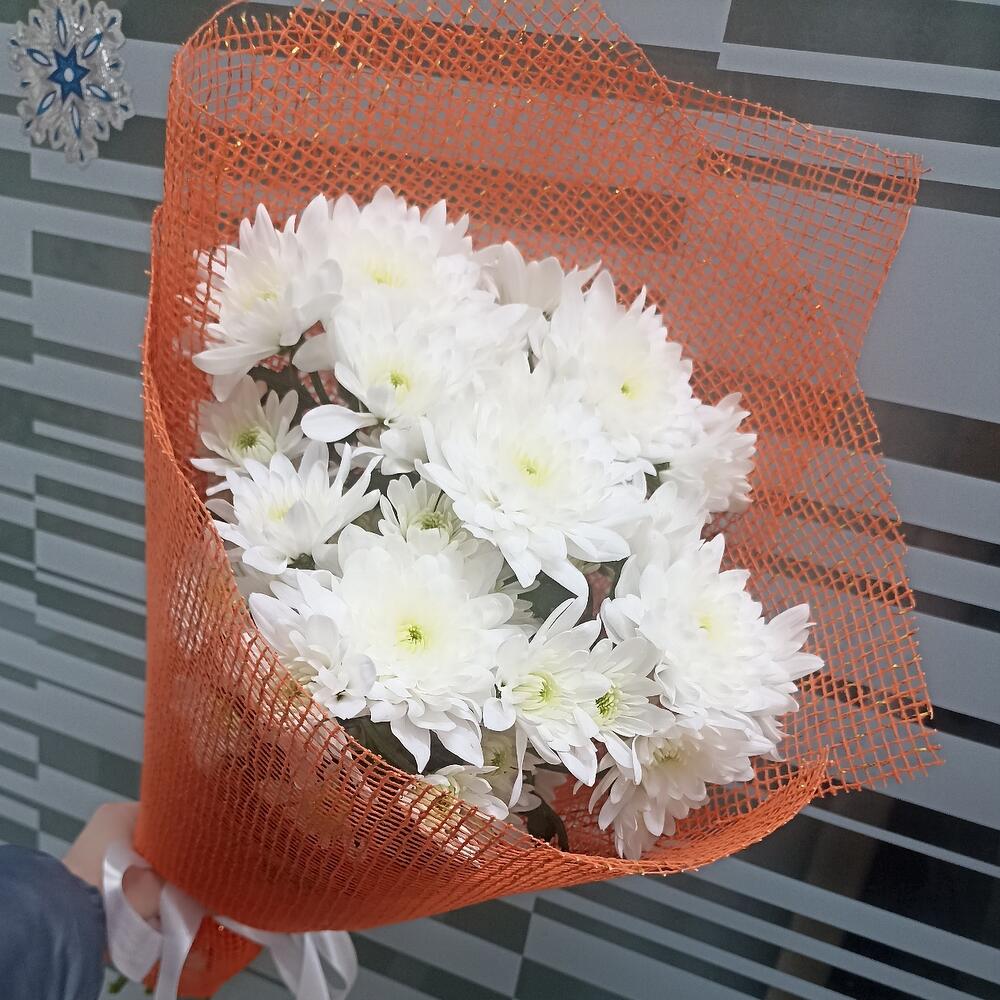 Лента атласная – 1 шт.Хризантема кустовая белая – 5 шт.Сетка – 2 шт.