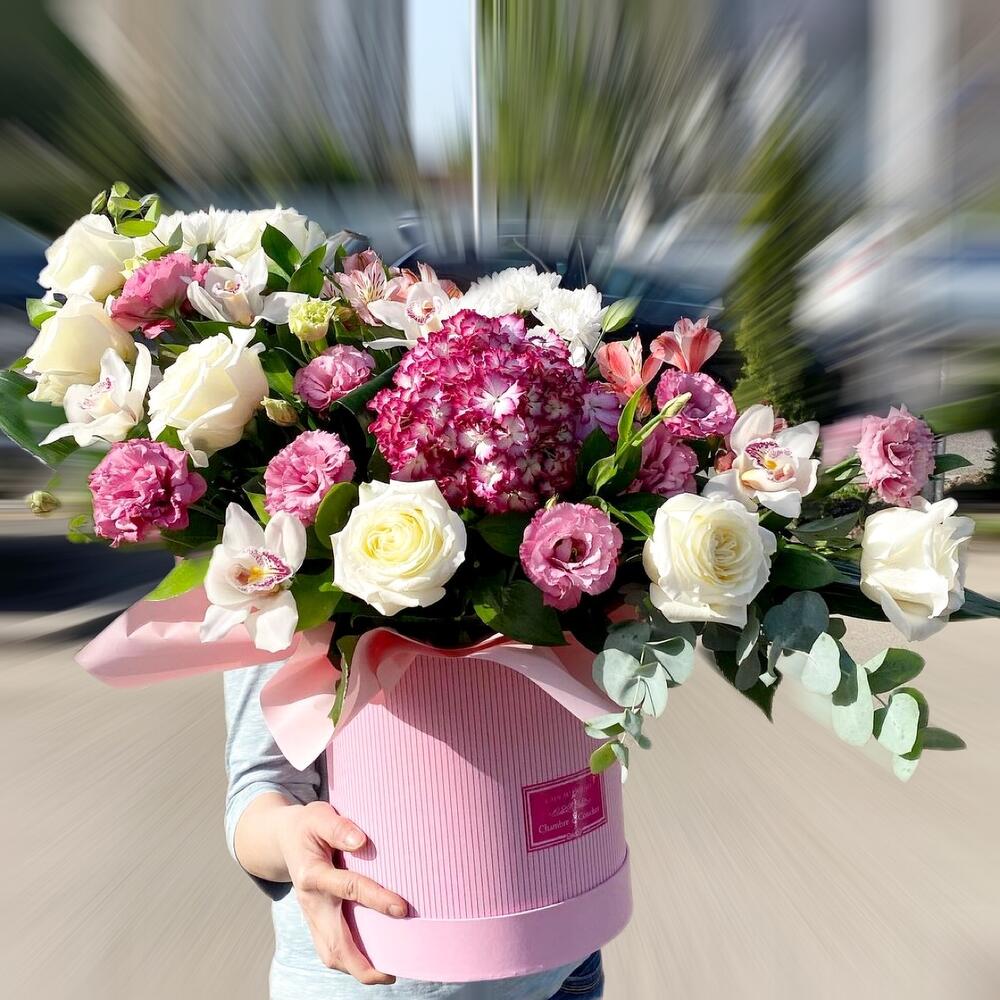 Альстромерии, Гортензии, Кустовые розы, Лизиантусы, Розы, Хризантемы