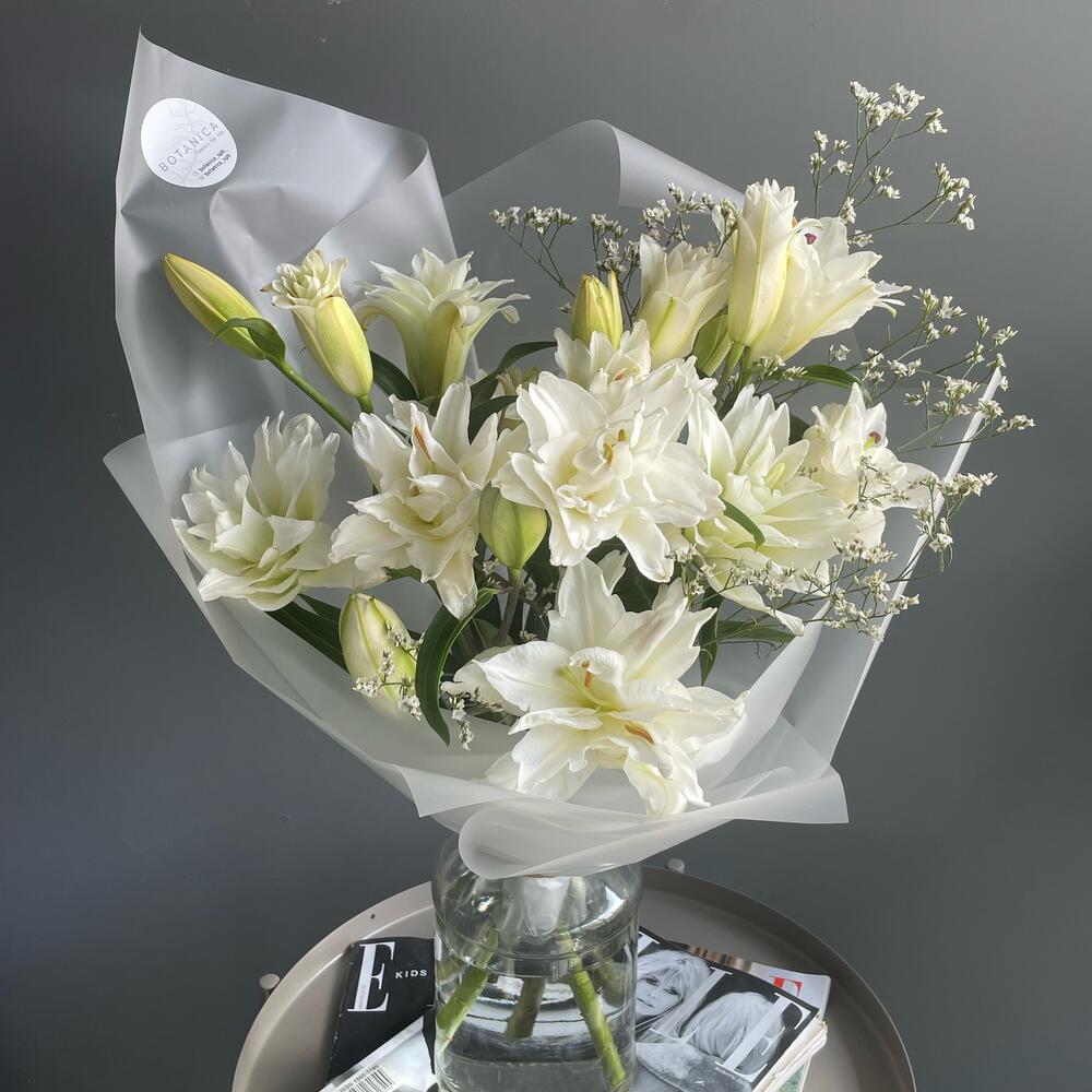 Лимониум – 1 шт.Лента атласная – 1 шт.Лилия белая – 5 шт.Пленка матовая – 4 шт.