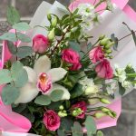 Маттиола – 2 шт.Эустома – 2 шт.Орхидея Цимбидиум – 1 шт.Эвкалипт – 2 шт.Зелень – 5 шт.Упаковка дизайнерская – 1 шт.Лента атласная – 1 шт.