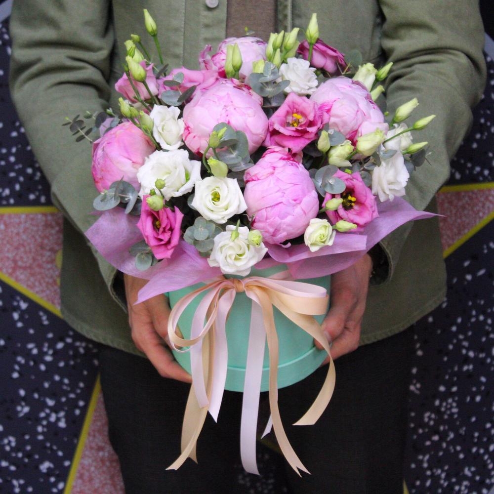 Пион Сара Бернар – 5 шт.эустома микс – 5 шт.Эвкалипт – 3 шт.Оазис флористический – 1 шт.Коробка шляпная – 1 шт.Лента атласная – 2 шт.