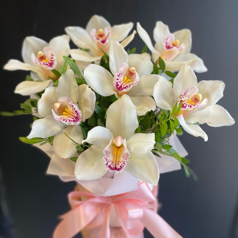 Зелень – 8 шт.Упаковка – 3 шт.Лента атласная – 5 шт.Коробка шляпная – 1 шт.орхидея цимбидиум розоваябелая – 7 шт.