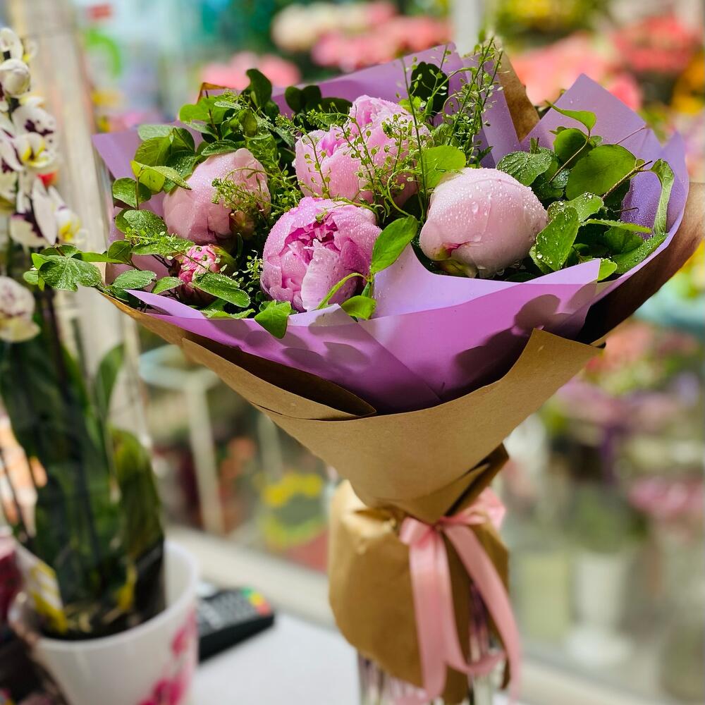 Упаковка – 2 шт.зелень декоративная – 3 шт.пионы – 5 шт.