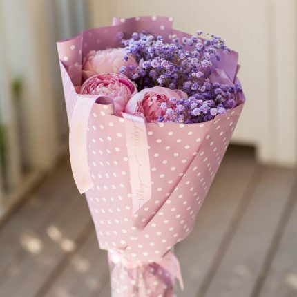 розовые пионы сара бернар – 5 шт.белая маттиола – 3 шт.Эвкалипт – 1 шт.Упаковка дизайнерская – 1 шт.