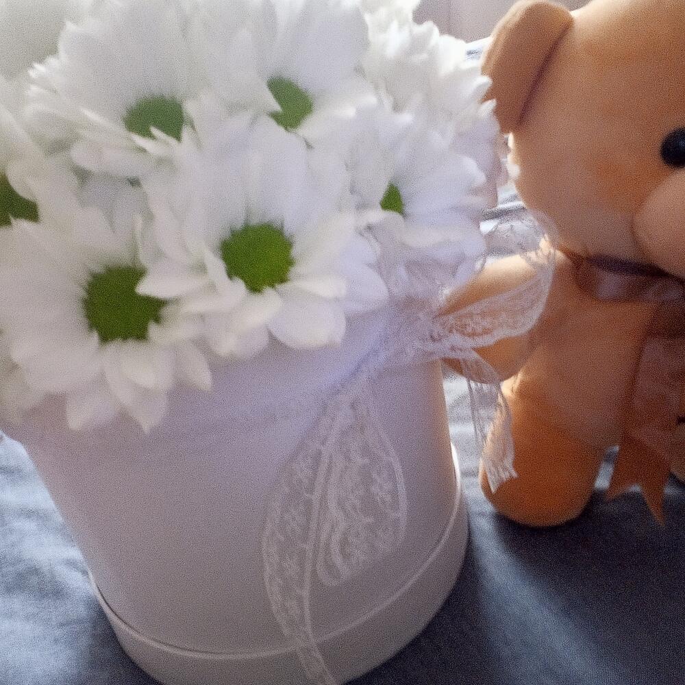 Ромашка – 25 шт.Шляпная коробка – 1 шт.Лента Кружево – 1 шт.Губка флористическая – 1 шт.Мишка плюшевый – 1 шт.