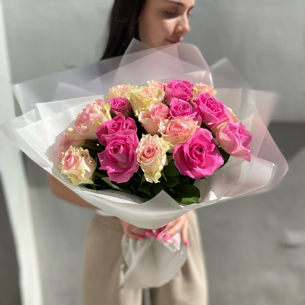 Роза Кенийская – 21 шт.Тишью – 2 шт.Упаковка дизайнерская – 4 шт.Лента атласная – 2 шт.