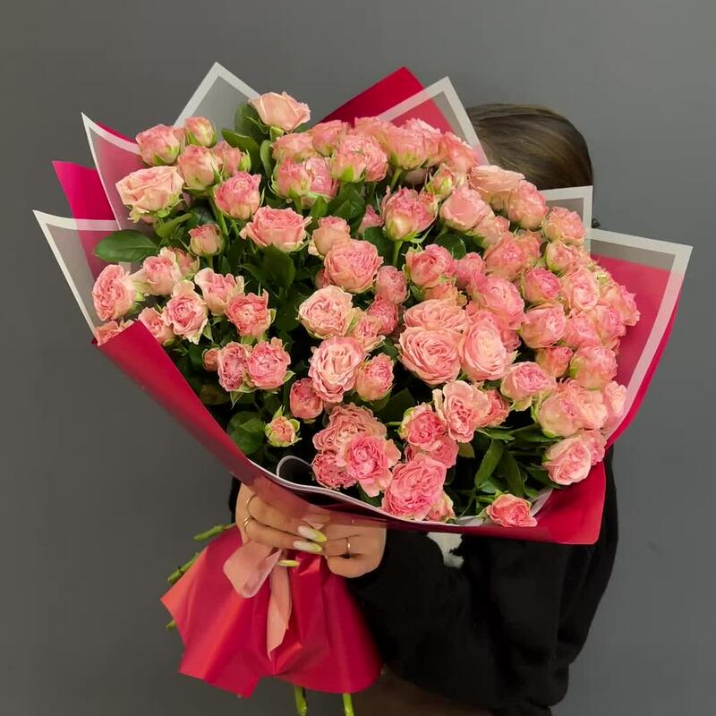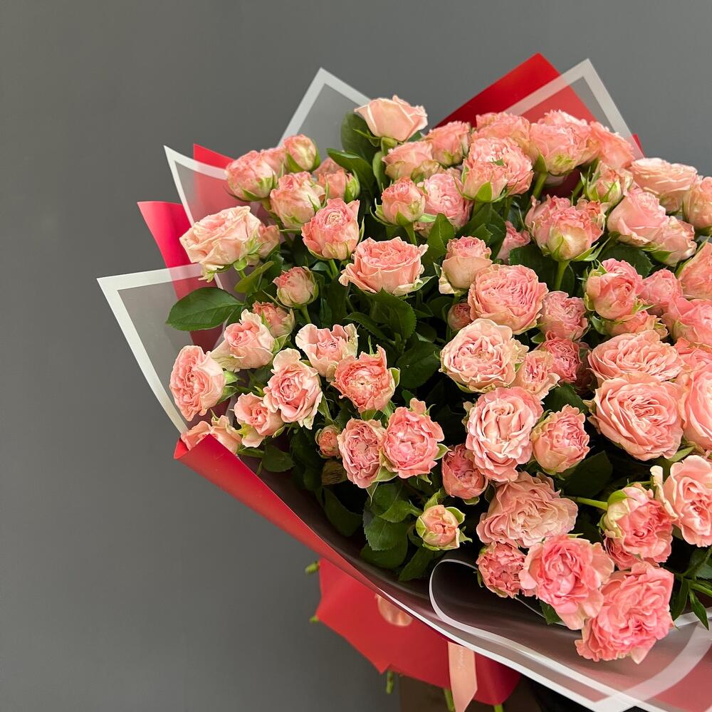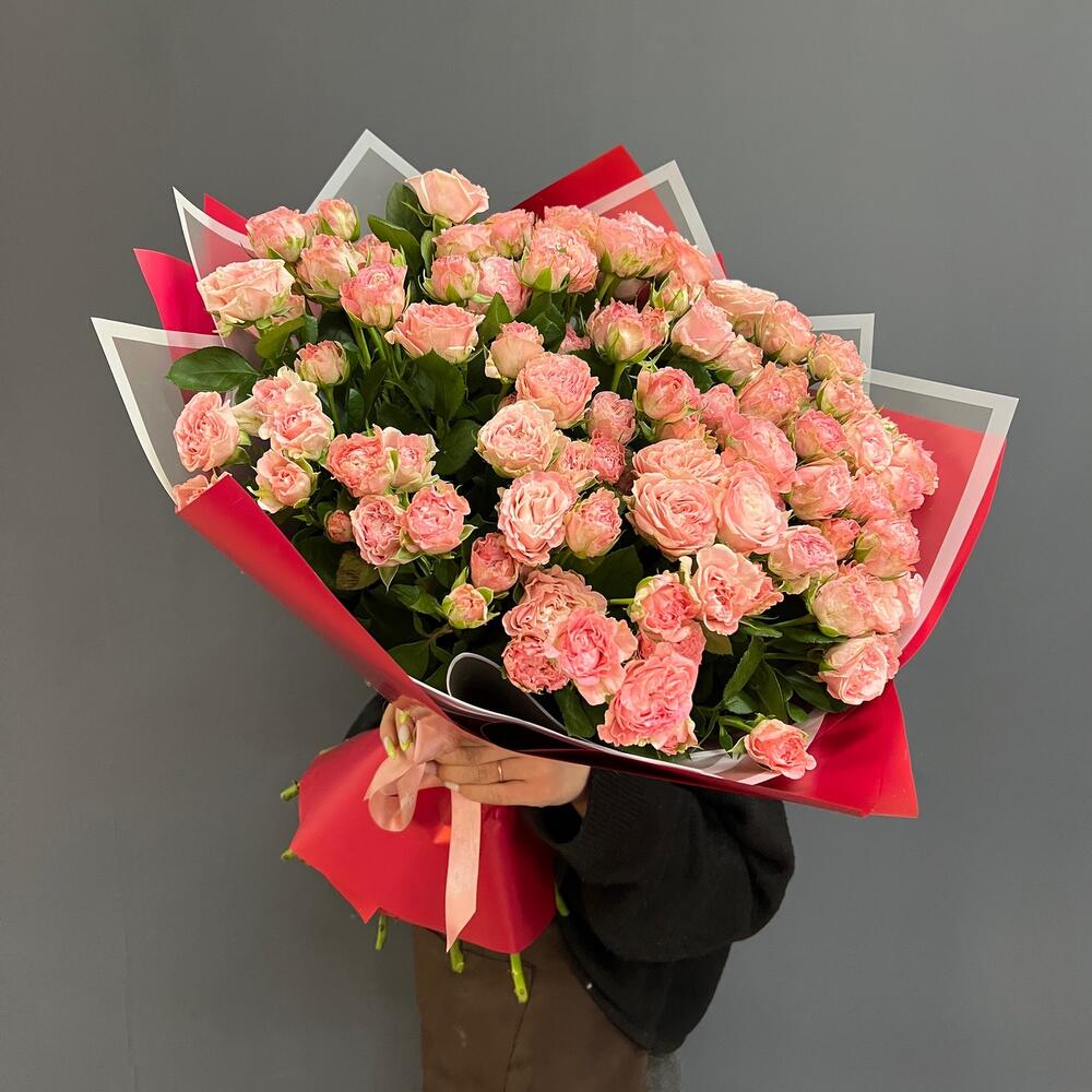 Атласная лента – 1 шт.Пионовидная кустовая роза – 29 шт.Дизайнерская упаковка – 1 шт.