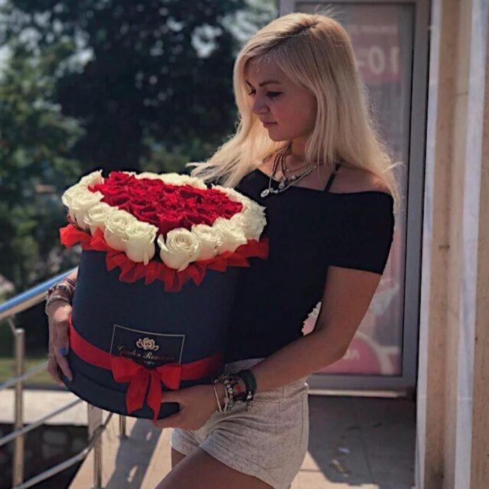 Роза Эквадор – 51 шт.Шляпная коробка – 1 шт.Оазис флористический – 1 шт.окантовка из тишью – 1 шт.