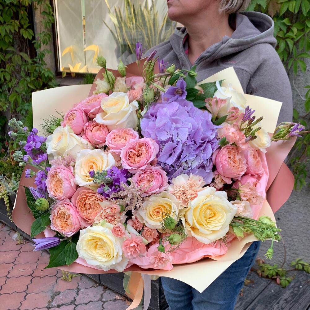Астильба – 2 шт.Маттиола – 3 шт.Бант – 1 шт.Роза пионовидная – 8 шт.Клематис – 3 шт.Упаковка дизайнерская – 2 шт.Нигелла – 2 шт.Диантус сортовой – 7 шт.Роза кустовая пионовидная джульетта – 5 шт.зелень декоративная – 5 шт.гортензия лавандовая – 1 шт.лизиантус алиса шампань – 3 шт.трителлия – 3 шт.