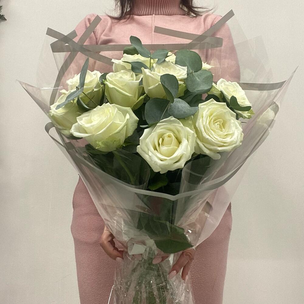 Роза Эквадор – 11 шт.Эвкалипт – 5 шт.Упаковка дизайнерская – 1 шт.Лента – 1 шт.