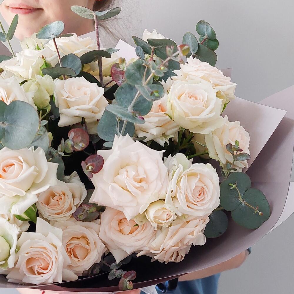 Букет из кустовых роз и эвкалипта