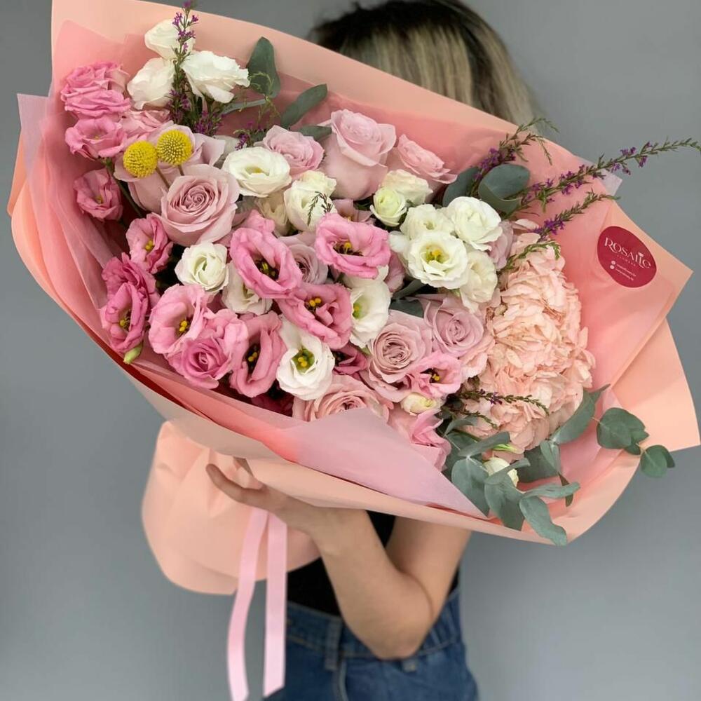 Гвоздики, Лизиантусы, Розы, Тюльпаны