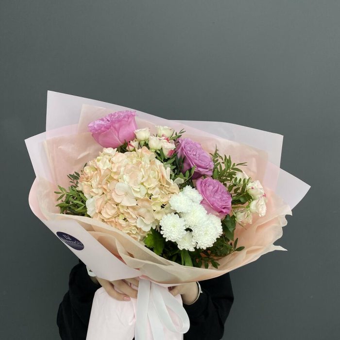 Альстромерии, Гортензии, Кустовые розы, Лизиантусы, Розы, Хризантемы