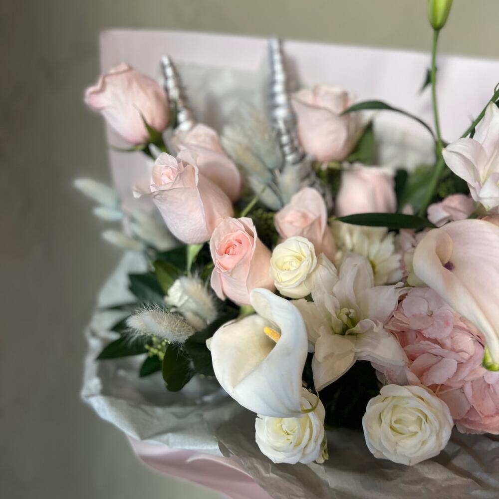 Альстромерии, Кустовые розы, Лизиантусы, Пионовидные розы, Розы, Ромашки