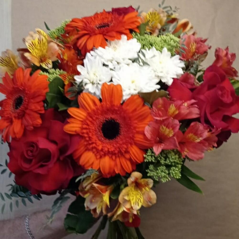 Альстромерия – 5 шт. Роза красная – 3 шт. Хризантема кустовая белая – 1 шт. Гербера красная – 3 шт.