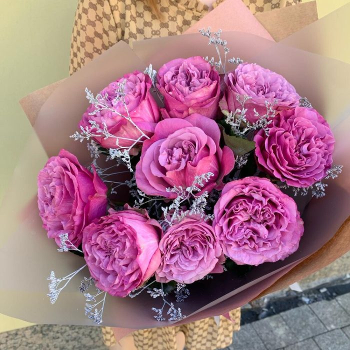 ЧЕРНИЧНЫЙ ЙОГУРТ 9 премиальных пионовидных роз с белым лимониумом в крафт бумаге