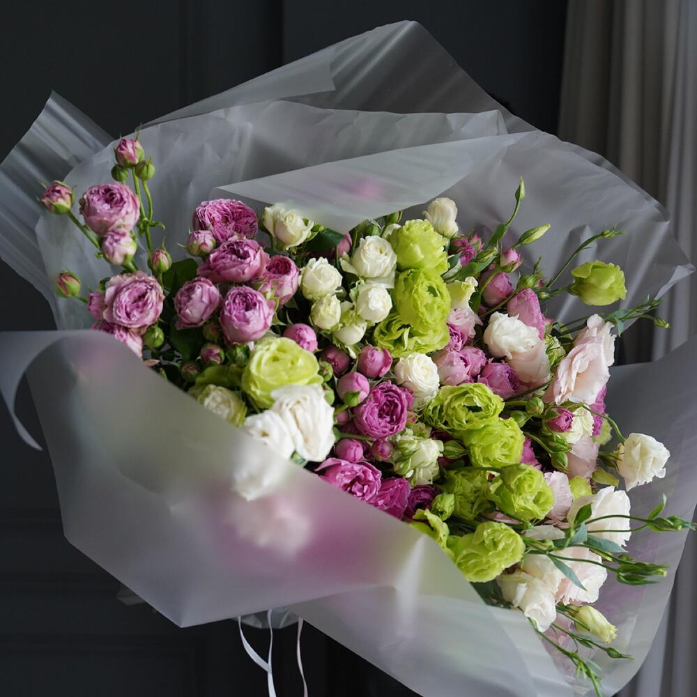 Альстромерии, Гортензии, Кустовые розы, Лизиантусы, Розы, Хризантемы