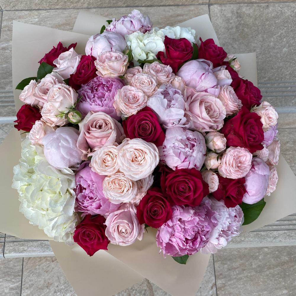 пион или пионовидная роза – 15 шт.Роза – 13 шт.Роза пионовидная – 10 шт.Салал пучок – 1 шт.Гортензия – 2 шт.роза куст пионовидная – 7 шт.Упаковка дизайнерская – 1 шт.