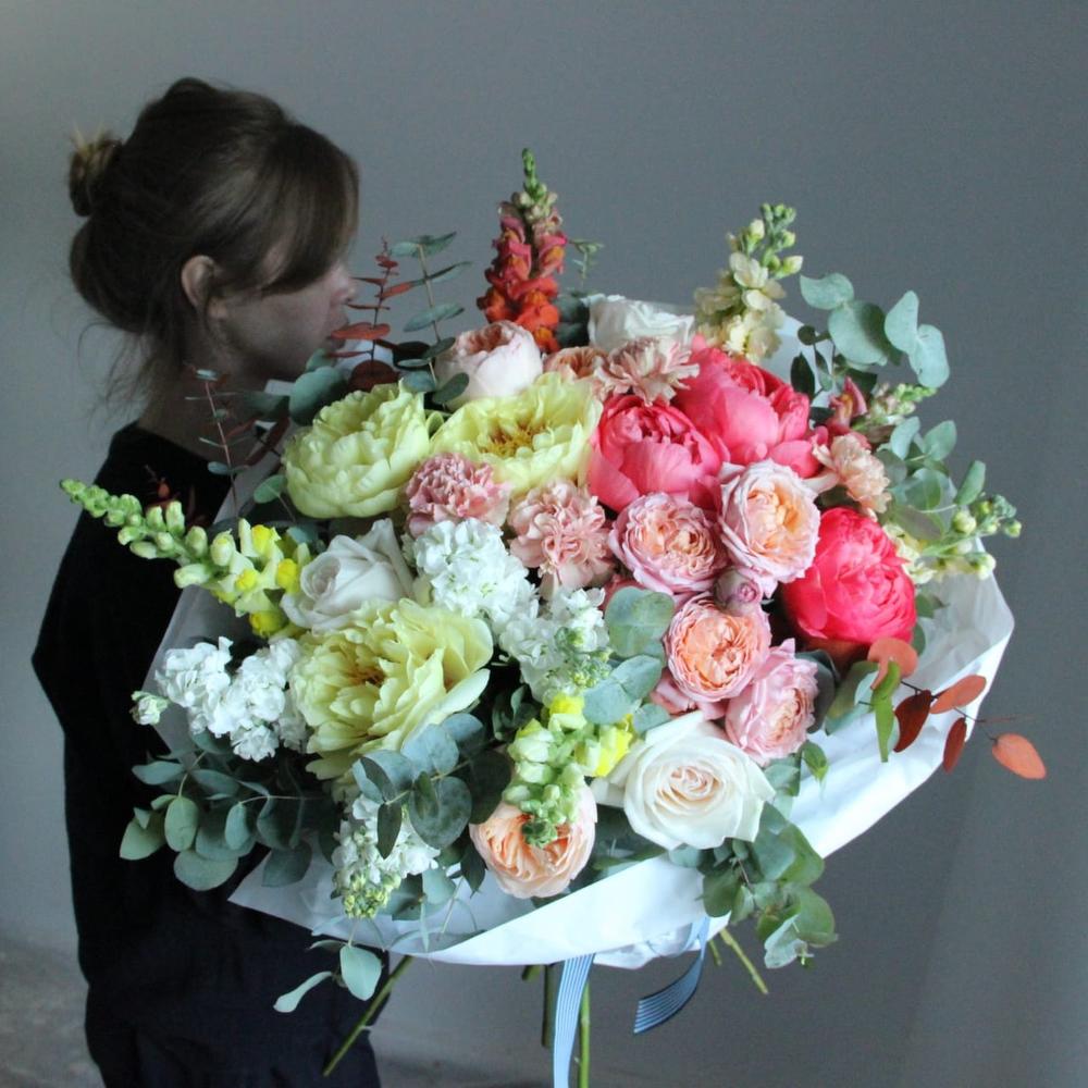 Пион Голландия – 6 шт.Львиный зев – 6 шт.Маттиола – 6 шт.Роза пионовидная – 7 шт.Роза пионовидная кустовая – 3 шт.Гвоздика – 5 шт.Эвкалипт – 9 шт.Бумага – 3 шт.Лента атласная – 2 шт.