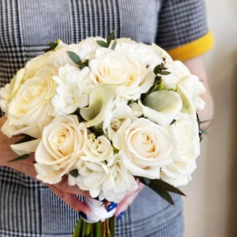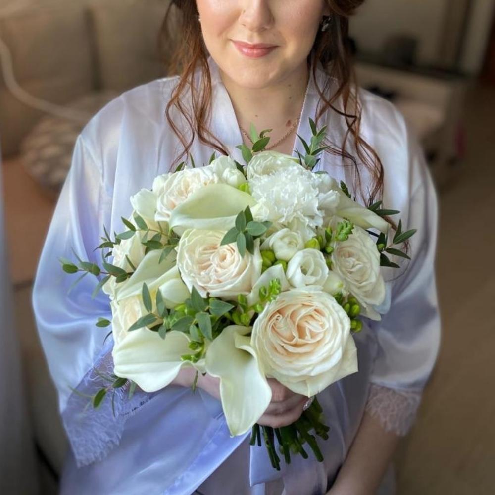 Эвкалипт – 2 шт.Лента атласная – 1 шт.Гвоздика белая – 3 шт.Фрезия белая – 7 шт.Калла белая – 7 шт.Роза пионовидная белая – 9 шт.Булавка с бусами – 4 шт.