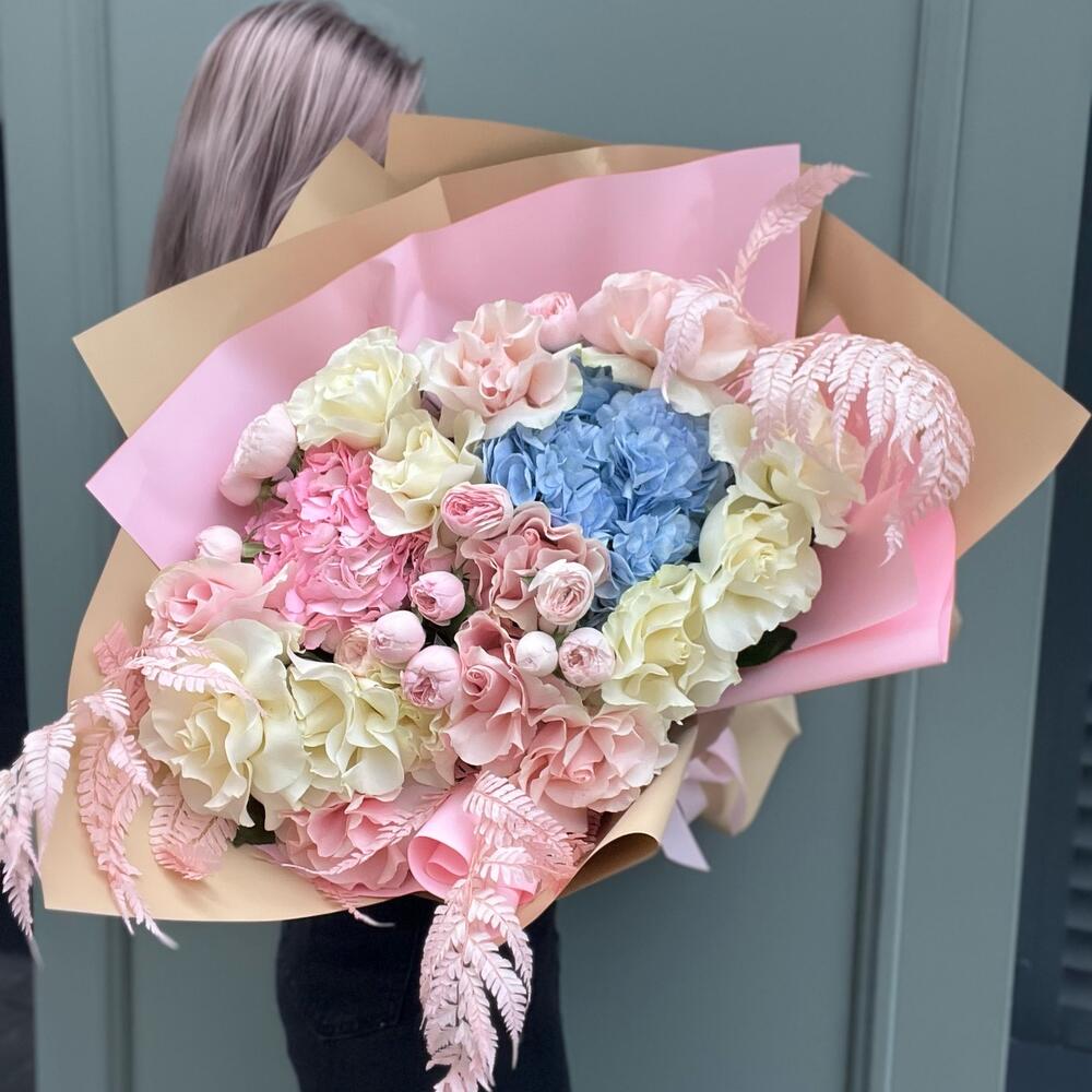 Альстромерии, Гвоздики, Кустовые розы, Лизиантусы, Розы, Хризантемы
