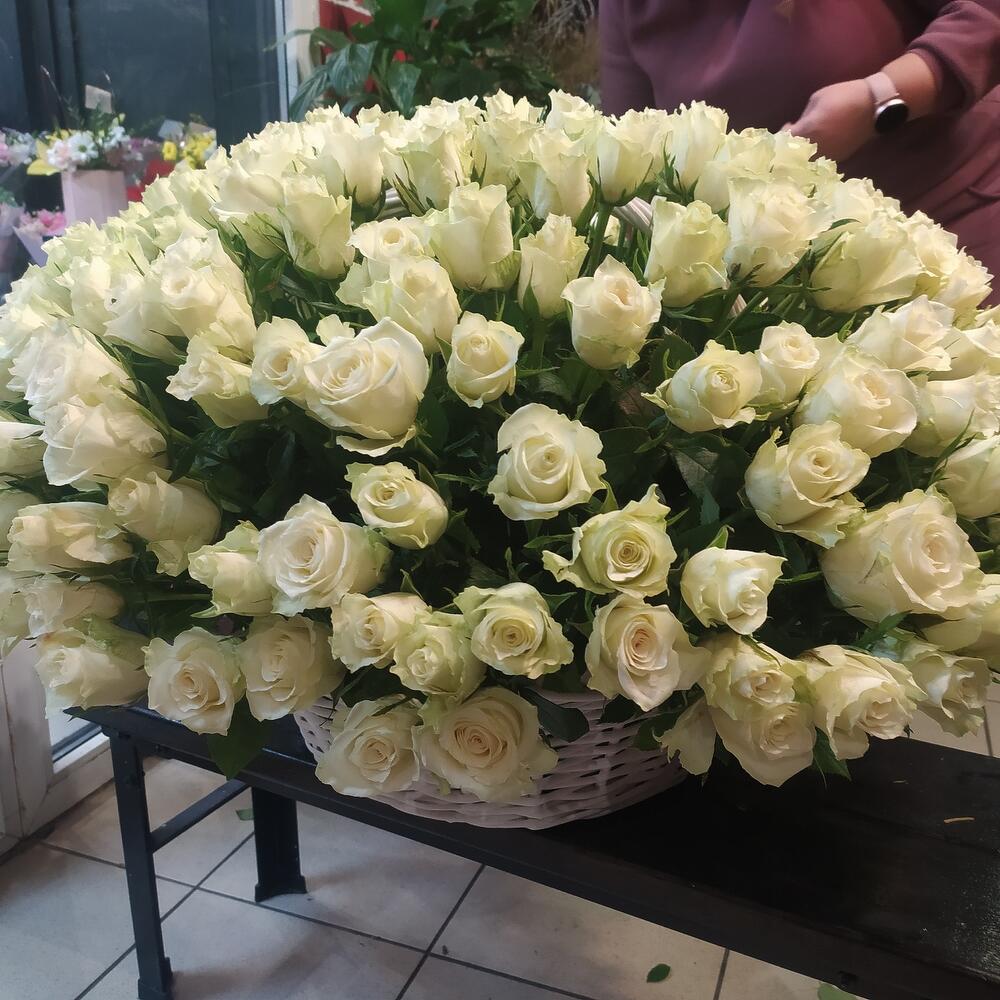 Роза белая – 255 шт.Корзина плетеная – 1 шт.Оазис флористический – 6 шт.