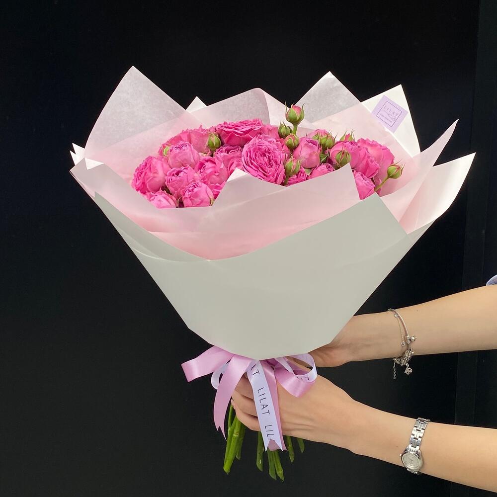 Упаковка дизайнерская – 2 шт. Открыточка с вашими пожеланиями – 1 шт. Misty Bubbles пионовидная роза – 11 шт.