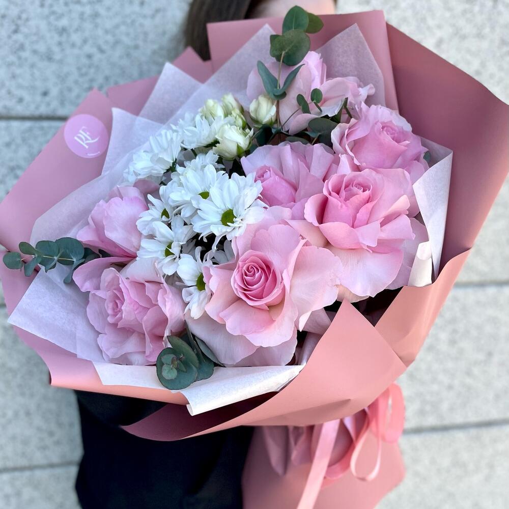 Альстромерии, Гвоздики, Кустовые розы, Лизиантусы, Розы, Хризантемы
