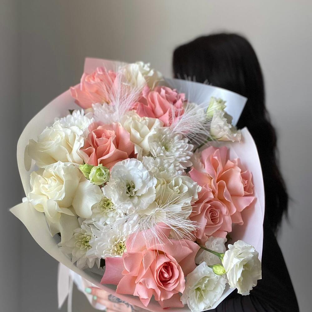 Альстромерии, Гвоздики, Кустовые розы, Лизиантусы, Розы, Хризантемы