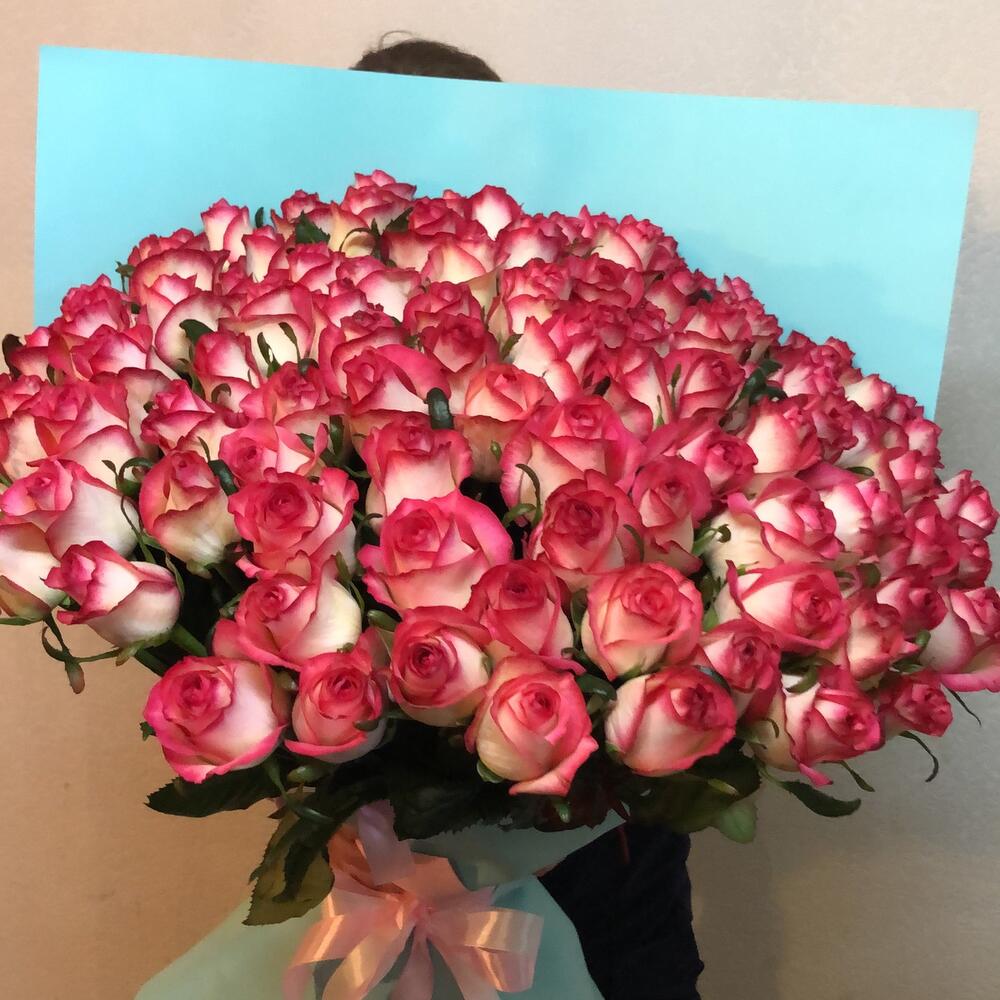 101 роза 60 см бело розовыеШикарные Ароматные розыВ стильной упаковке фоамиранОчень популярная упаковкаСтойкость отличная при правильном уходе!Стойкость до 14 дней !’доставим быстра чётко и достойно!