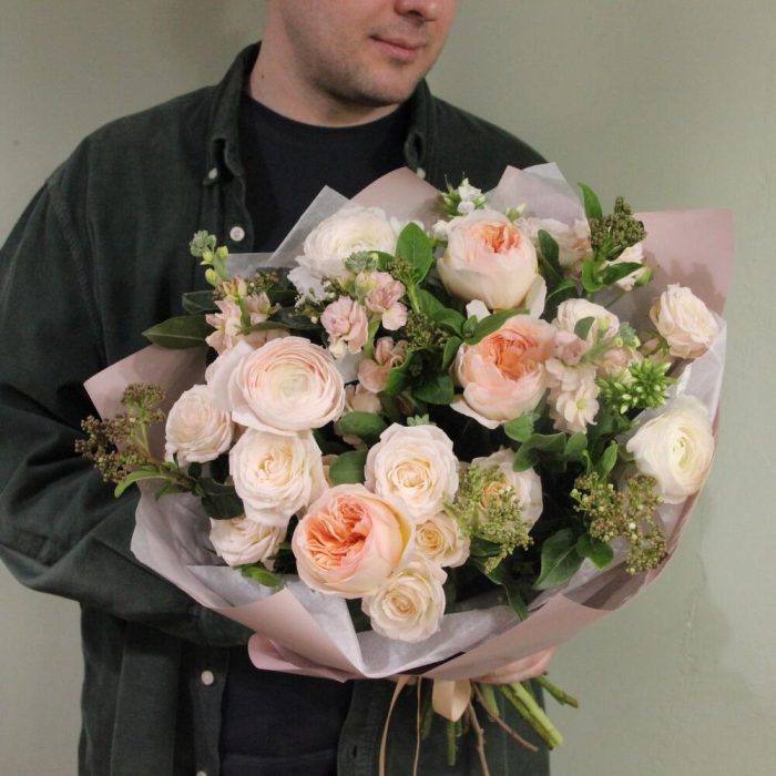 роза английская садовая – 3 шт.Ранункулюс – 3 шт.Роза кустовая пионовидная – 3 шт.Флокс – 2 шт.Маттиола – 3 шт.Вибурнум – 3 шт.Упаковка – 1 шт.