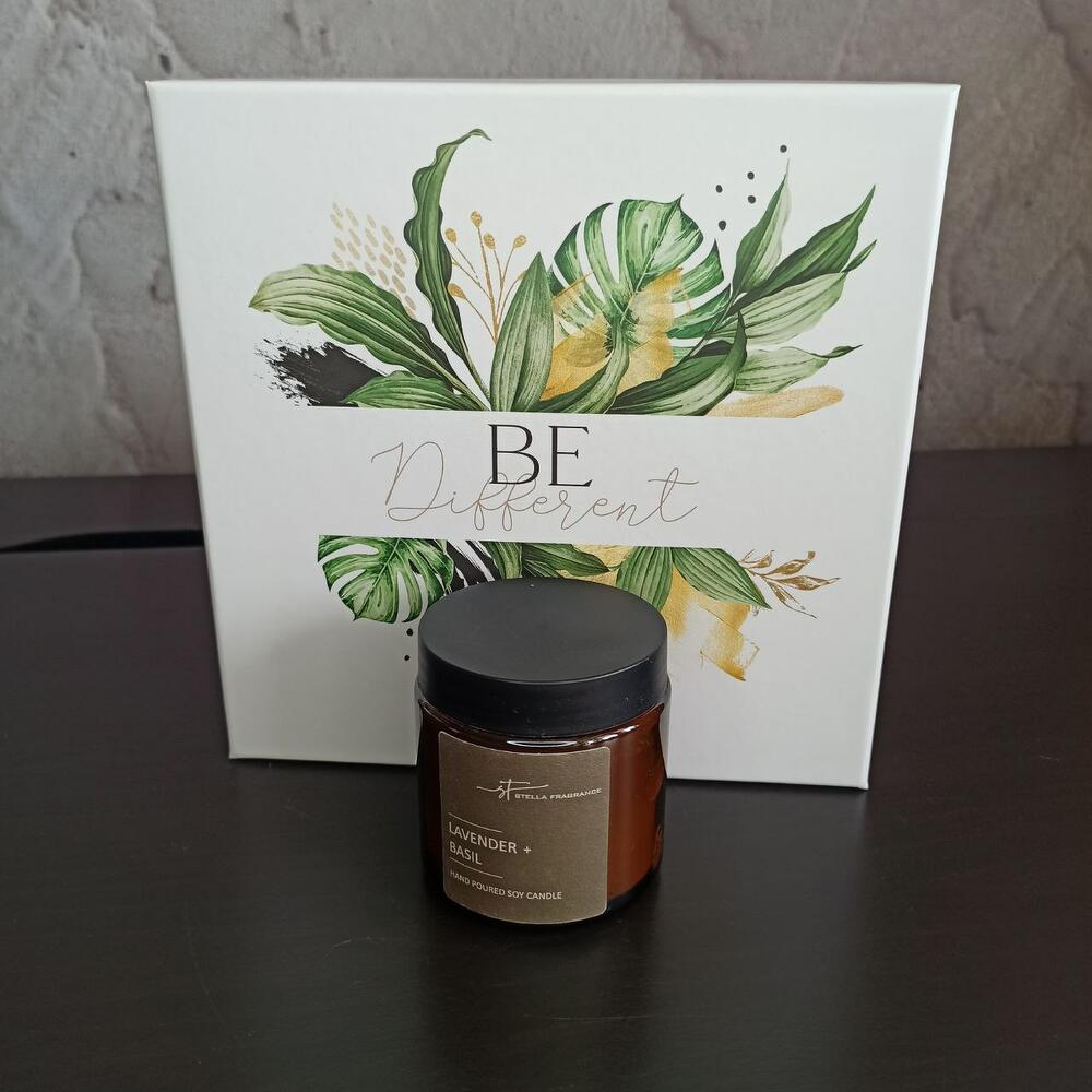 Коробка подарочная – 1 шт.свеча ароматическая лаванда и базилик – 1 шт.маска тканевая для лица – 3 шт.массажное мыло-скраб – 1 шт.расслабляющая соль для ванной с лепестками душицы – 1 шт.
