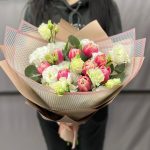 Тюльпан пионовидный – 9 шт.Эустома белая махровая – 3 шт.Эвкалипт – 2 шт.Пленка матовая – 5 шт.Лента атласная – 2 шт.