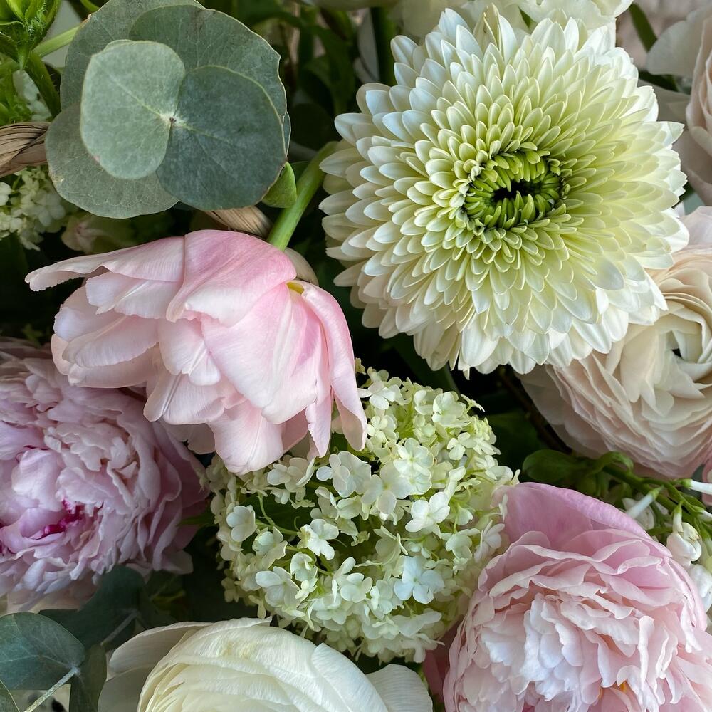 Лукошко из сада с ранункулюсами и пионами