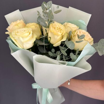 7 пионовидных роз с эвкалиптом